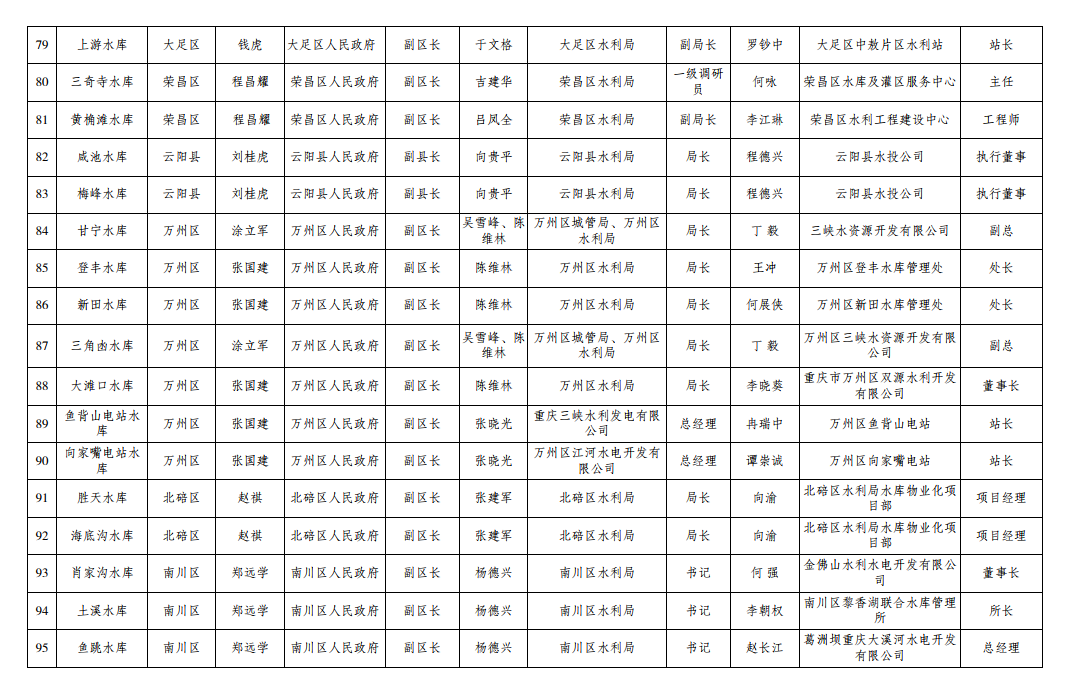 根据水利部办运管函〔2020〕114号文件要求,各区县确定并报送了18座大型、110座中型水库的大坝安全责任人名单。现按照有关规定,将全市大、中型水库大坝安全责任人名单予以公示。